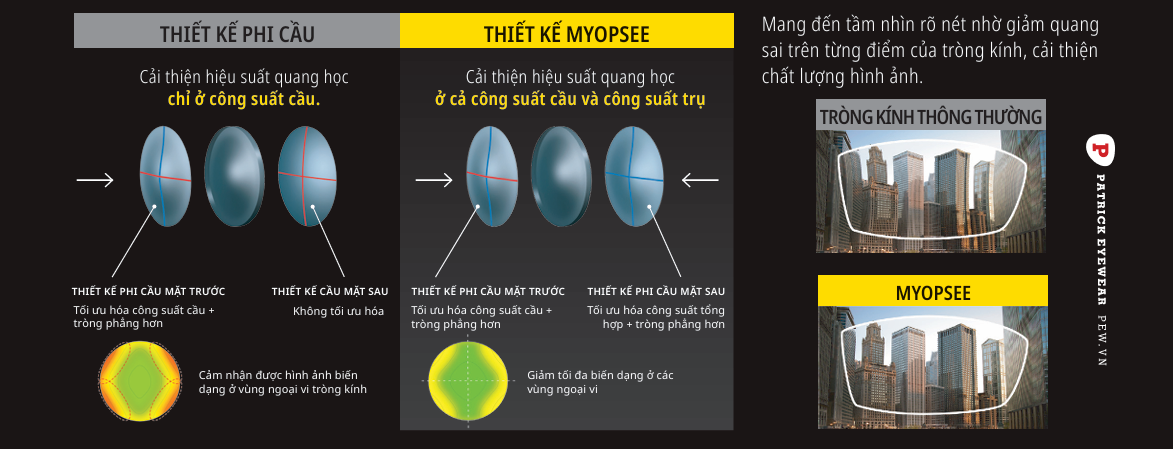Thiết kế phi cầu kép giúp hình ảnh giữa hai mắt được đồng bộ và cân bằng, loại bỏ hiệu ứng “fish-eye” (mắt cá) thường gặp ở tròng độ cao.